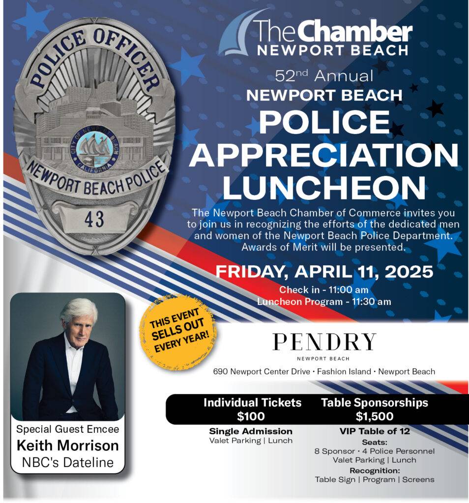 The Commodores Club of the Newport Beach Chamber of Commerce will honor the City’s finest and hard working individuals at the 51st Annual Police Appreciation Luncheon. The Chamber recognizes the Newport Beach Police Department in an effort to show how much residents and local businesses appreciate the work these men and women do for Newport Beach.
