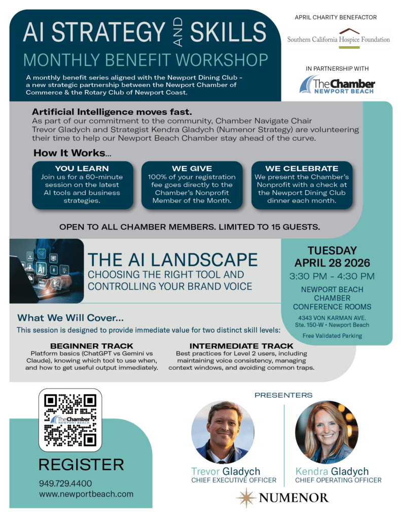 AI Strategy and Skills – Monthly Benefit Workshop – April When 04/28/2026 3:30 pm - 4:30 pm Add To Calendar Download ICS Google Calendar iCalendar Office 365 Outlook Live Where Newport Beach Chamber of Commerce 4343 Von Karman Ave., Ste. 150-W, Newport Beach, CA, 92660 Event Type Chamber Events Featured Limited to 15 participants. Reserve Your Spot Early! Use the form below. Sponsored by Charity Benefactor RegistrationHow did you hear about this event?Please select...Received an eMailSaw on Social MediaReferred from a friendOtherChamber Member Ticket012$45.00 Per GuestGuest 1 Name* First Last Guest 1 Company*Guest 2 Name* First Last Guest 2 Company*Non Member Ticket012$55.00 Per GuestNM Guest 1* First Last NM Guest 1 Company*NM Guest 2* First Last NM Guest 2 Company*Total $0.00 Payment Method* Credit Card Billing / Contact InformationBilling Name*Phone*Email* Address* Street Address Address Line 2 City AlabamaAlaskaAmerican SamoaArizonaArkansasCaliforniaColoradoConnecticutDelawareDistrict of ColumbiaFloridaGeorgiaGuamHawaiiIdahoIllinoisIndianaIowaKansasKentuckyLouisianaMaineMarylandMassachusettsMichiganMinnesotaMississippiMissouriMontanaNebraskaNevadaNew HampshireNew JerseyNew MexicoNew YorkNorth CarolinaNorth DakotaNorthern Mariana IslandsOhioOklahomaOregonPennsylvaniaPuerto RicoRhode IslandSouth CarolinaSouth DakotaTennesseeTexasUtahU.S. Virgin IslandsVermontVirginiaWashingtonWest VirginiaWisconsinWyomingArmed Forces AmericasArmed Forces EuropeArmed Forces Pacific State ZIP Code Credit Card American ExpressDiscoverMasterCardVisaSupported Credit Cards: American Express, Discover, MasterCard, Visa Card Number Month010203040506070809101112 Year20262027202820292030203120322033203420352036203720382039204020412042204320442045 Expiration Date Security Code Cardholder Name