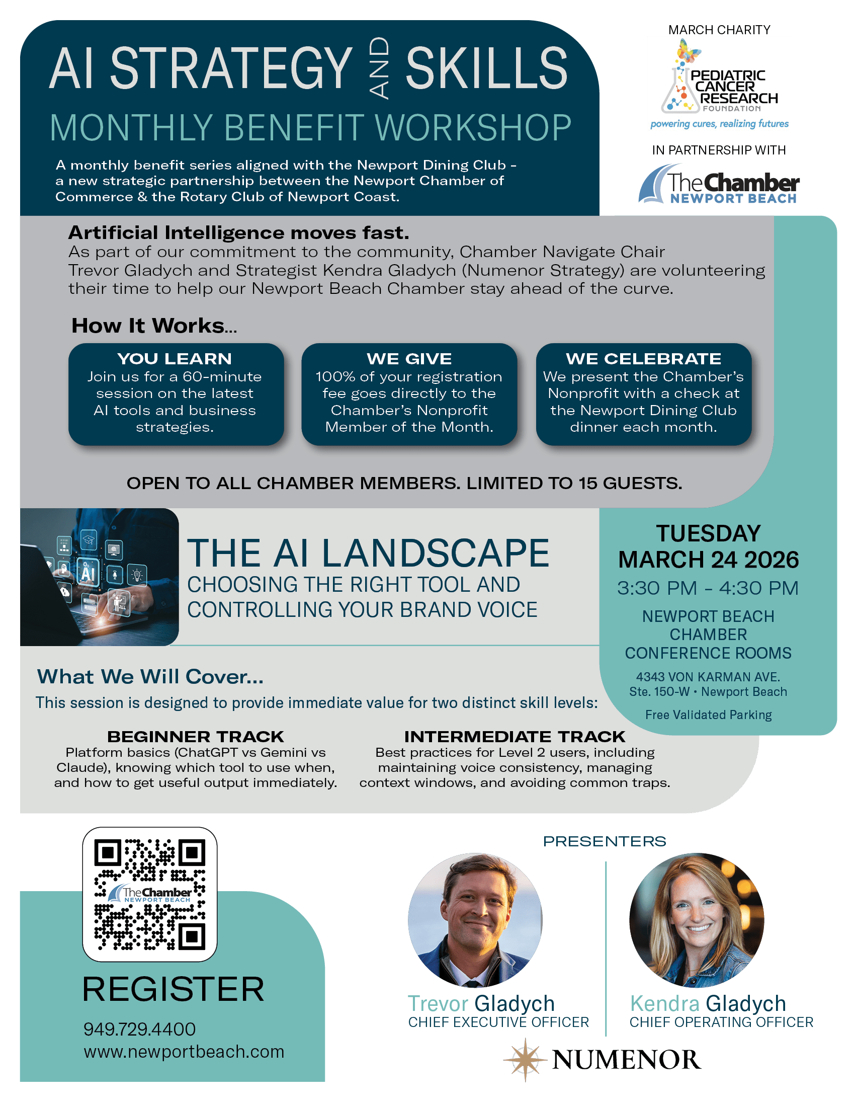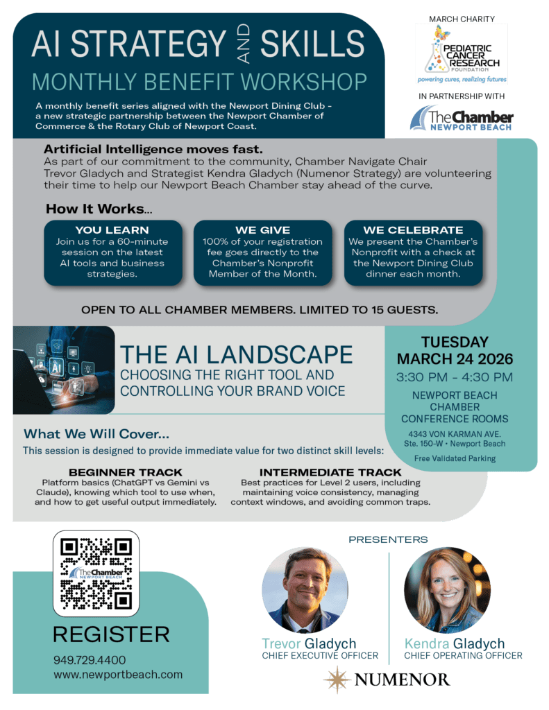 AI Strategy and Skills – Monthly Benefit Workshop – March When 03/24/2026 3:30 pm - 4:30 pm Add To Calendar Download ICS Google Calendar iCalendar Office 365 Outlook Live Where Newport Beach Chamber of Commerce 4343 Von Karman Ave., Ste. 150-W, Newport Beach, CA, 92660 Event Type Chamber Events Featured Limited to 15 participants. Reserve Your Spot Early! Use the form below. Sponsored by Charity Benefactor RegistrationHow did you hear about this event?Please select...Received an eMailSaw on Social MediaReferred from a friendOtherChamber Member Ticket012$45.00 Per GuestGuest 1 Name* First Last Guest 1 Company*Guest 2 Name* First Last Guest 2 Company*Non Member Ticket012$55.00 Per GuestNM Guest 1* First Last NM Guest 1 Company*NM Guest 2* First Last NM Guest 2 Company*Total $0.00 Payment Method* Credit Card Billing / Contact InformationBilling Name*Phone*Email* Address* Street Address Address Line 2 City AlabamaAlaskaAmerican SamoaArizonaArkansasCaliforniaColoradoConnecticutDelawareDistrict of ColumbiaFloridaGeorgiaGuamHawaiiIdahoIllinoisIndianaIowaKansasKentuckyLouisianaMaineMarylandMassachusettsMichiganMinnesotaMississippiMissouriMontanaNebraskaNevadaNew HampshireNew JerseyNew MexicoNew YorkNorth CarolinaNorth DakotaNorthern Mariana IslandsOhioOklahomaOregonPennsylvaniaPuerto RicoRhode IslandSouth CarolinaSouth DakotaTennesseeTexasUtahU.S. Virgin IslandsVermontVirginiaWashingtonWest VirginiaWisconsinWyomingArmed Forces AmericasArmed Forces EuropeArmed Forces Pacific State ZIP Code Credit Card American ExpressDiscoverMasterCardVisaSupported Credit Cards: American Express, Discover, MasterCard, Visa Card Number Month010203040506070809101112 Year20262027202820292030203120322033203420352036203720382039204020412042204320442045 Expiration Date Security Code Cardholder Name