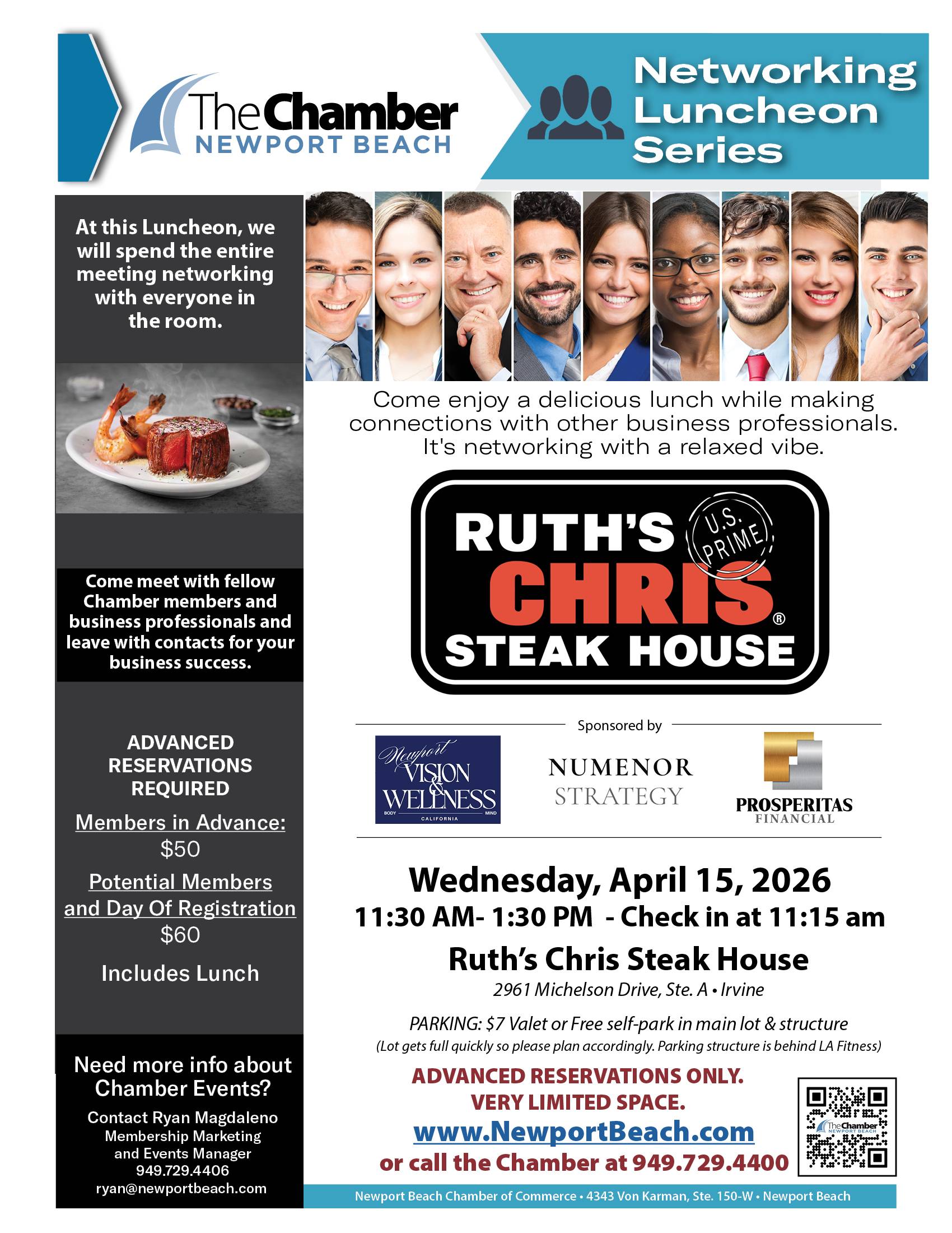 April 2026 Networking Luncheon Series – Ruths Chris Steak House When 04/15/2026 11:30 am - 1:30 pm Add To Calendar Download ICS Google Calendar iCalendar Office 365 Outlook Live Where Ruth's Chris Steak House 2961 Michelson Drive, Ste. A, Irvine, CA Event Type Chamber Events Featured Onlilne reservations are now closed. For possible seating, please call 949-729-4400. SPONSORED BY RegistrationHow did you hear about this event?Please select...Received an eMailSaw on Social MediaReferred from a friendOtherChamber Member Ticket012$50.00 Per GuestGuest 1 Name* First Last Guest 1 Company*Guest 2 Name* First Last Guest 2 Company*Non Member Ticket012$60.00 Per GuestNM Guest 1* First Last NM Guest 1 Company*NM Guest 2* First Last NM Guest 2 Company*Total $0.00 Payment Method* Credit Card If payment method is Chamber Bucks, you must be a current Chamber Member and you MUST call the Chamber at 949-729-4400 to confirm your reservations.Billing / Contact InformationBilling Name*Phone*Email* Address* Street Address Address Line 2 City AlabamaAlaskaAmerican SamoaArizonaArkansasCaliforniaColoradoConnecticutDelawareDistrict of ColumbiaFloridaGeorgiaGuamHawaiiIdahoIllinoisIndianaIowaKansasKentuckyLouisianaMaineMarylandMassachusettsMichiganMinnesotaMississippiMissouriMontanaNebraskaNevadaNew HampshireNew JerseyNew MexicoNew YorkNorth CarolinaNorth DakotaNorthern Mariana IslandsOhioOklahomaOregonPennsylvaniaPuerto RicoRhode IslandSouth CarolinaSouth DakotaTennesseeTexasUtahU.S. Virgin IslandsVermontVirginiaWashingtonWest VirginiaWisconsinWyomingArmed Forces AmericasArmed Forces EuropeArmed Forces Pacific State ZIP Code Credit Card American ExpressDiscoverMasterCardVisaSupported Credit Cards: American Express, Discover, MasterCard, Visa Card Number Month010203040506070809101112 Year20262027202820292030203120322033203420352036203720382039204020412042204320442045 Expiration Date Security Code Cardholder Name