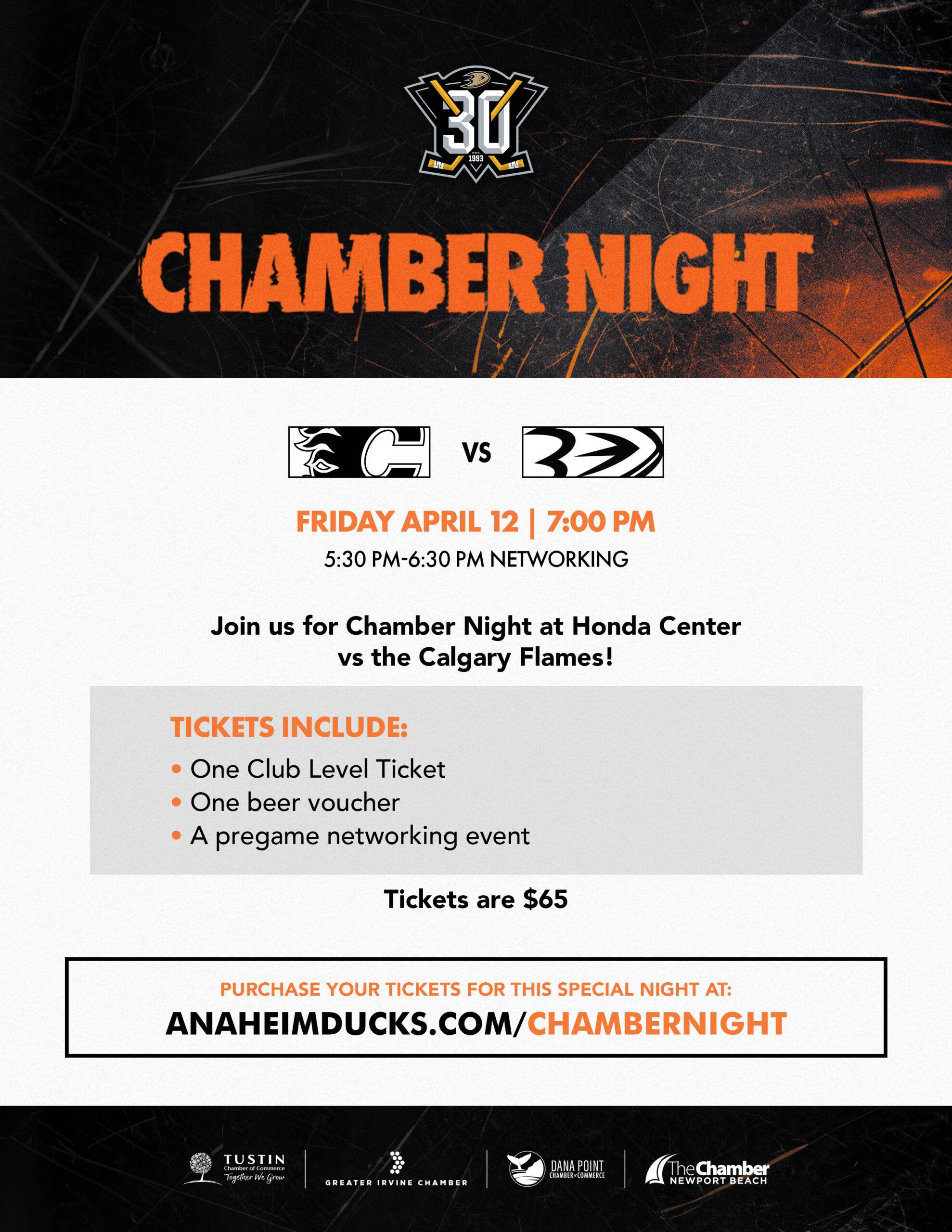 Chamber Night at Anaheim Ducks When 04/12/2024 5:30 pm - 9:00 pm Add To Calendar Download ICS Google Calendar iCalendar Office 365 Outlook Live Where Honda Center 2695 E. Katella Ave., Anaheim, CA, 92806 Event Type Chamber Events Featured Local Events PURCHASE TICKETS HERE