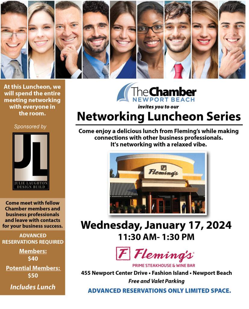January Networking Luncheon Series – Fleming’s Prime Steakhouse and Wine Bar When 01/17/2024 11:30 am - 1:30 pm Add To Calendar Download ICS Google Calendar iCalendar Office 365 Outlook Live Where Fleming's Prime Steakhouse and Wine Bar 455 Newport Center Drive, Newport Beach, CA, 92660 Event Type Chamber Events Featured Limited Space Available Reserve Your Spot Early