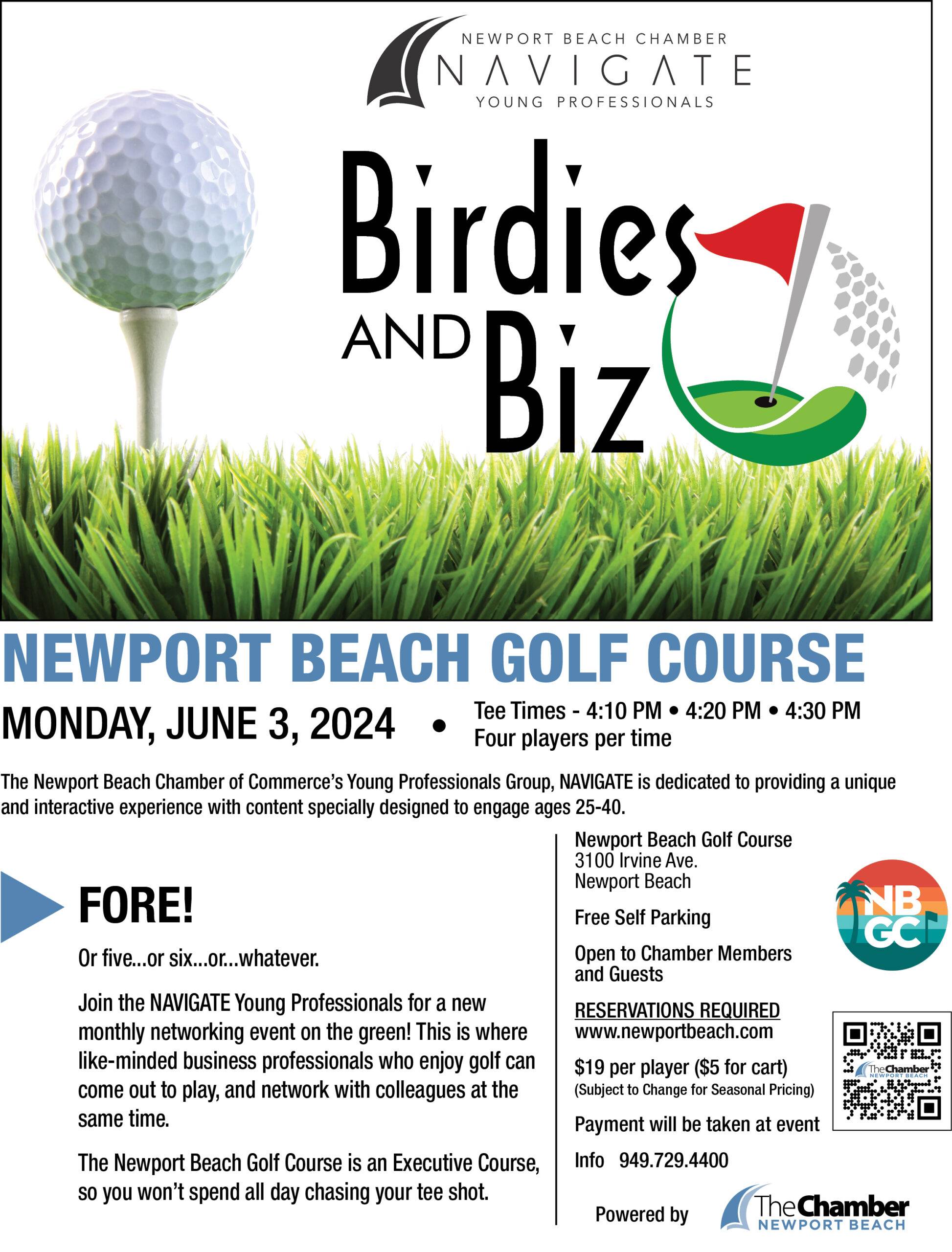 June 2024 NAVIGATE: Birdies and Biz When 06/03/2024 4:10 pm - 6:00 pm Add To Calendar Download ICS Google Calendar iCalendar Office 365 Outlook Live Where Newport Beach Golf Course 3100 Irvine Ave, Newport Beach, CA, 92660 Event Type Chamber Events Featured Sold Out. All tee times have been booked.