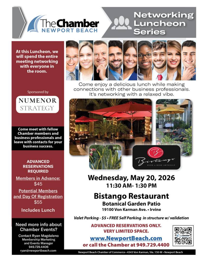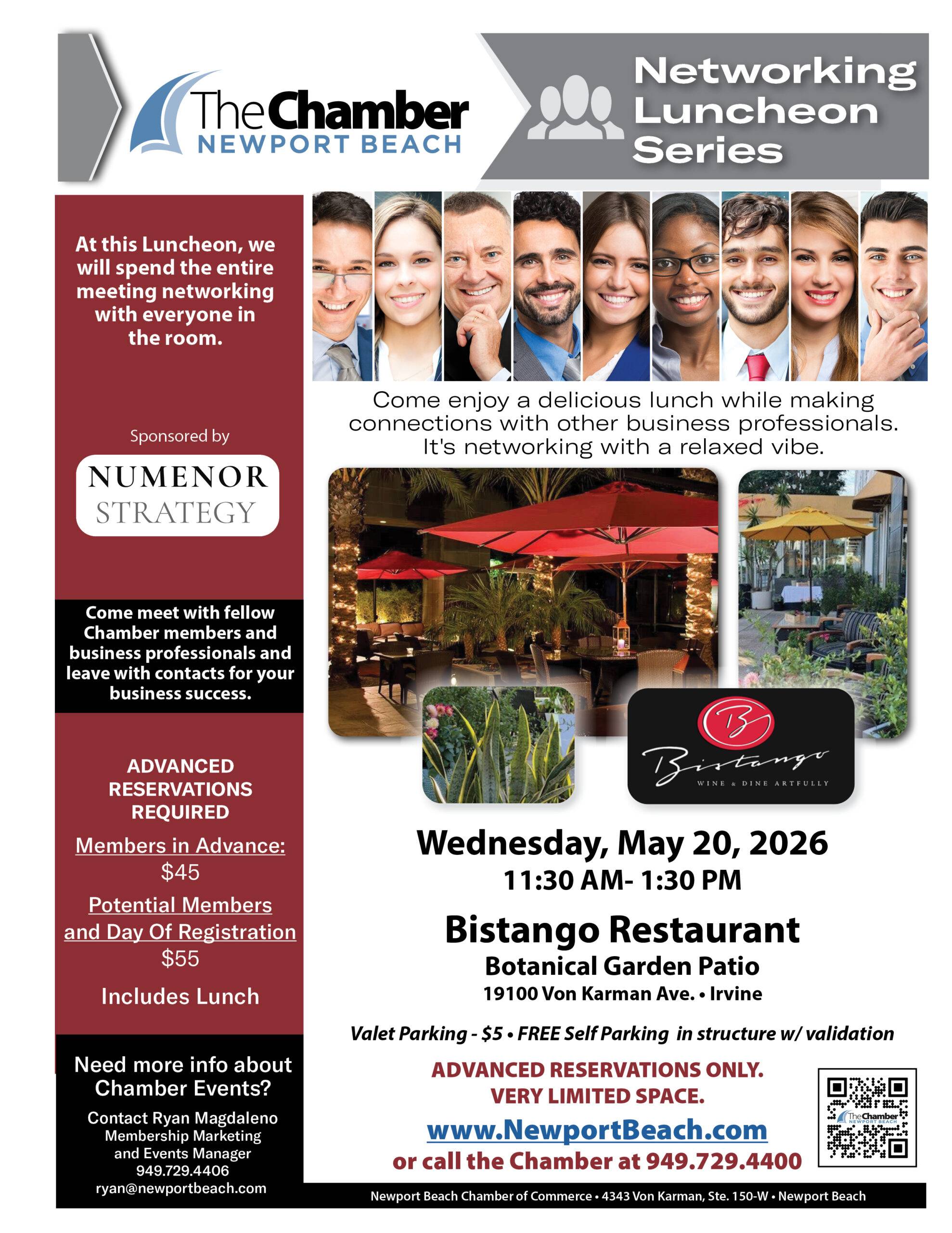 May 2026 Networking Luncheon Series – Bistango When 05/20/2026 11:30 am - 1:30 pm Add To Calendar Download ICS Google Calendar iCalendar Office 365 Outlook Live Where Bistango 19100 Von Karman Avenue, Irvine, CA, 92612 Event Type Chamber Events Featured Limited Space. Reserve Your Spot Early! Use the form below. SPONSORED BY RegistrationHow did you hear about this event?Please select...Received an eMailSaw on Social MediaReferred from a friendOtherChamber Member Ticket012$45.00 Per GuestGuest 1 Name* First Last Guest 1 Company*Guest 2 Name* First Last Guest 2 Company*Non Member Ticket012$55.00 Per GuestNM Guest 1* First Last NM Guest 1 Company*NM Guest 2* First Last NM Guest 2 Company*Total $0.00 Payment Method* Credit Card If payment method is Chamber Bucks, you must be a current Chamber Member and you MUST call the Chamber at 949-729-4400 to confirm your reservations.Billing / Contact InformationBilling Name*Phone*Email* Address* Street Address Address Line 2 City AlabamaAlaskaAmerican SamoaArizonaArkansasCaliforniaColoradoConnecticutDelawareDistrict of ColumbiaFloridaGeorgiaGuamHawaiiIdahoIllinoisIndianaIowaKansasKentuckyLouisianaMaineMarylandMassachusettsMichiganMinnesotaMississippiMissouriMontanaNebraskaNevadaNew HampshireNew JerseyNew MexicoNew YorkNorth CarolinaNorth DakotaNorthern Mariana IslandsOhioOklahomaOregonPennsylvaniaPuerto RicoRhode IslandSouth CarolinaSouth DakotaTennesseeTexasUtahU.S. Virgin IslandsVermontVirginiaWashingtonWest VirginiaWisconsinWyomingArmed Forces AmericasArmed Forces EuropeArmed Forces Pacific State ZIP Code Credit Card American ExpressDiscoverMasterCardVisaSupported Credit Cards: American Express, Discover, MasterCard, Visa Card Number Month010203040506070809101112 Year20262027202820292030203120322033203420352036203720382039204020412042204320442045 Expiration Date Security Code Cardholder Name