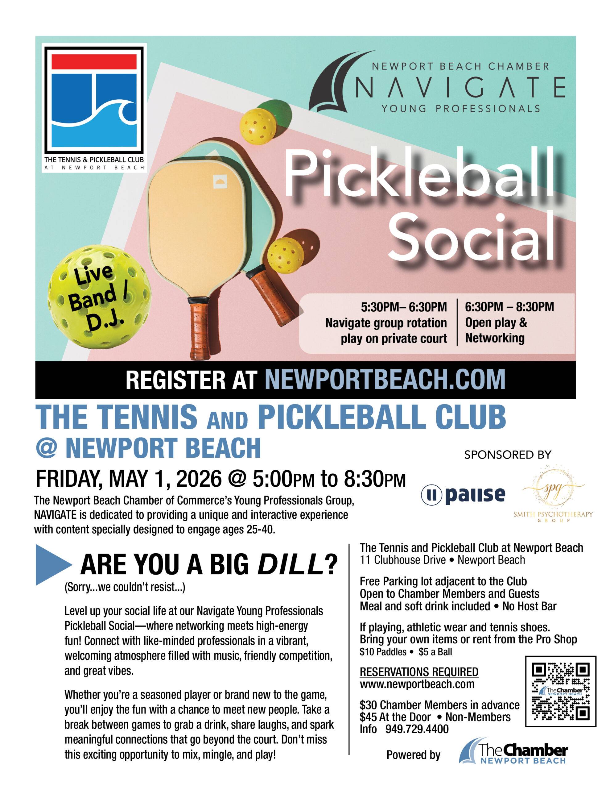 May NAVIGATE: Pickleball Social at The Tennis and Pickleball Club at Newport Beach When 05/01/2026 5:00 pm - 8:00 pm Add To Calendar Download ICS Google Calendar iCalendar Office 365 Outlook Live Where The Tennis and Pickleball Club at Newport Beach 11 Clubhouse Dr., Newport Beach, CA, 92660 Event Type Chamber Events Featured RegistrationHow did you hear about this event?Chamber Member Ticket012$30.00 Per GuestGuest 1 Name First Last Guest 1 eMailGuest 2 Name First Last Guest 2 eMailNon Member Ticket012$45.00 Per GuestNM Guest 1 First Last NM Guest 1 eMailNM Guest 2 First Last NM Guest 2 eMailTotal $0.00 Billing InformationPayment Method Credit Card Billing Name*Company*Phone*Email* Address* Street Address Address Line 2 City AlabamaAlaskaAmerican SamoaArizonaArkansasCaliforniaColoradoConnecticutDelawareDistrict of ColumbiaFloridaGeorgiaGuamHawaiiIdahoIllinoisIndianaIowaKansasKentuckyLouisianaMaineMarylandMassachusettsMichiganMinnesotaMississippiMissouriMontanaNebraskaNevadaNew HampshireNew JerseyNew MexicoNew YorkNorth CarolinaNorth DakotaNorthern Mariana IslandsOhioOklahomaOregonPennsylvaniaPuerto RicoRhode IslandSouth CarolinaSouth DakotaTennesseeTexasUtahU.S. Virgin IslandsVermontVirginiaWashingtonWest VirginiaWisconsinWyomingArmed Forces AmericasArmed Forces EuropeArmed Forces Pacific State ZIP Code Credit Card* American ExpressDiscoverMasterCardVisaSupported Credit Cards: American Express, Discover, MasterCard, Visa Card Number Month010203040506070809101112 Year20262027202820292030203120322033203420352036203720382039204020412042204320442045 Expiration Date Security Code Cardholder Name