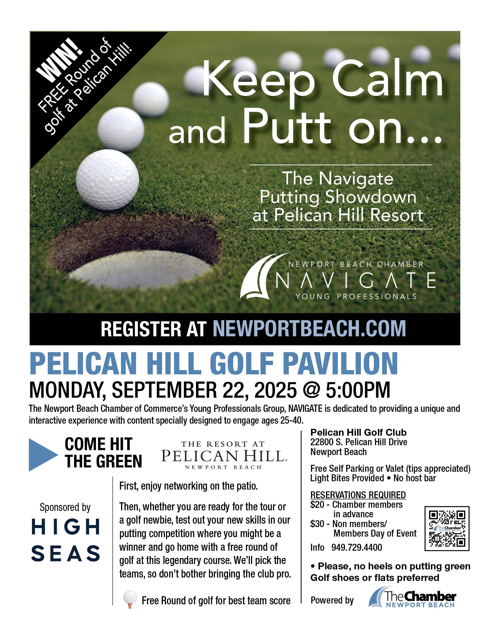 NAVIGATE September 2025 – Pelican Hill Resort Putting Showdown When 09/22/2025 5:00 pm - 7:30 pm Add To Calendar Download ICS Google Calendar iCalendar Office 365 Outlook Live Where Pelican Hill Golf Club 22800 S. Pelican Hill Dr., Newport Beach, CA, 92660, USA Event Type Chamber Events Featured Online Reservations are now closed. Please call 949-729-4400 for possible attendance. Thank You to Our Sponsor