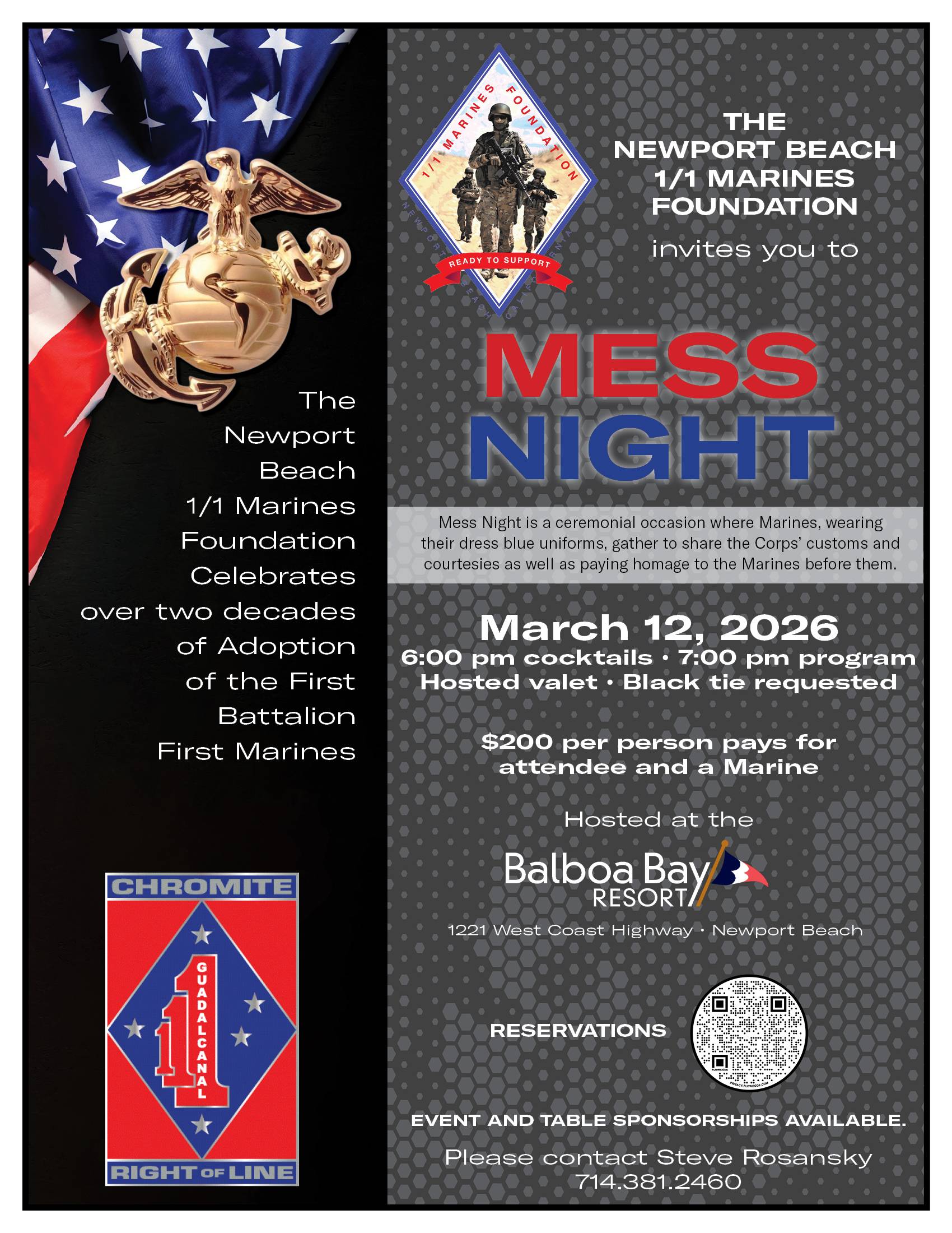 Newport Beach 1/1 Marines Foundation Invites You To: MESS NIGHT! When 03/12/2026 6:00 pm - 9:30 pm Add To Calendar Download ICS Google Calendar iCalendar Office 365 Outlook Live Where Balboa Bay Resort 1221 W. Coast Highway, Newport Beach, CA, 92663 Event Type Featured Local Events Buy Tickets Here