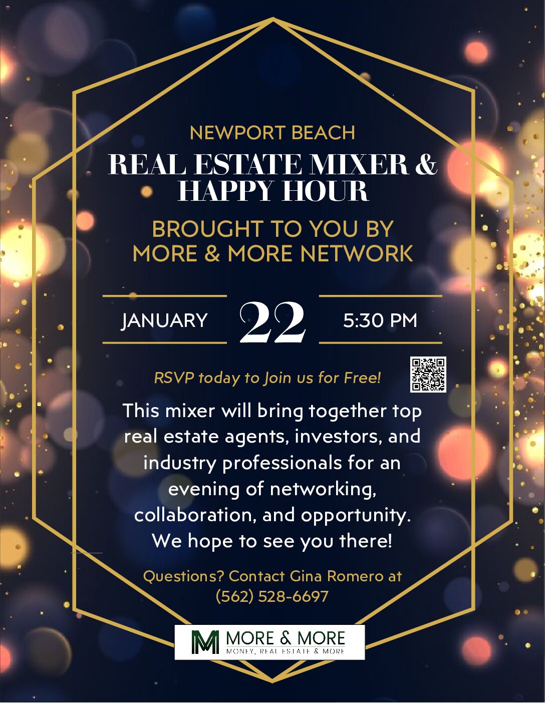 Newport Beach Real Estate Mixer When 01/22/2025 5:30 pm - 8:30 pm Add To Calendar Download ICS Google Calendar iCalendar Office 365 Outlook Live Where Newport Beach Civic Center 100 Civic Center Drive, Newport Beach, CA, 92660 Event Type Local Events RSVP Here