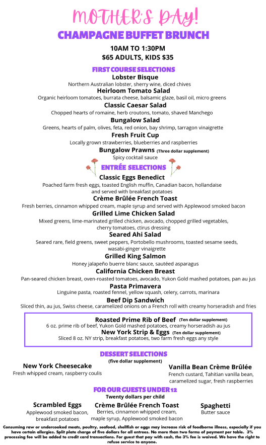 The Bungalow CDM Mother’s Day When 05/10/2026 All Day Add To Calendar Download ICS Google Calendar iCalendar Office 365 Outlook Live Where The Bungalow Restaurant 2441 East Coast Highway, Corona Del Mar , CA Event Type Local Events