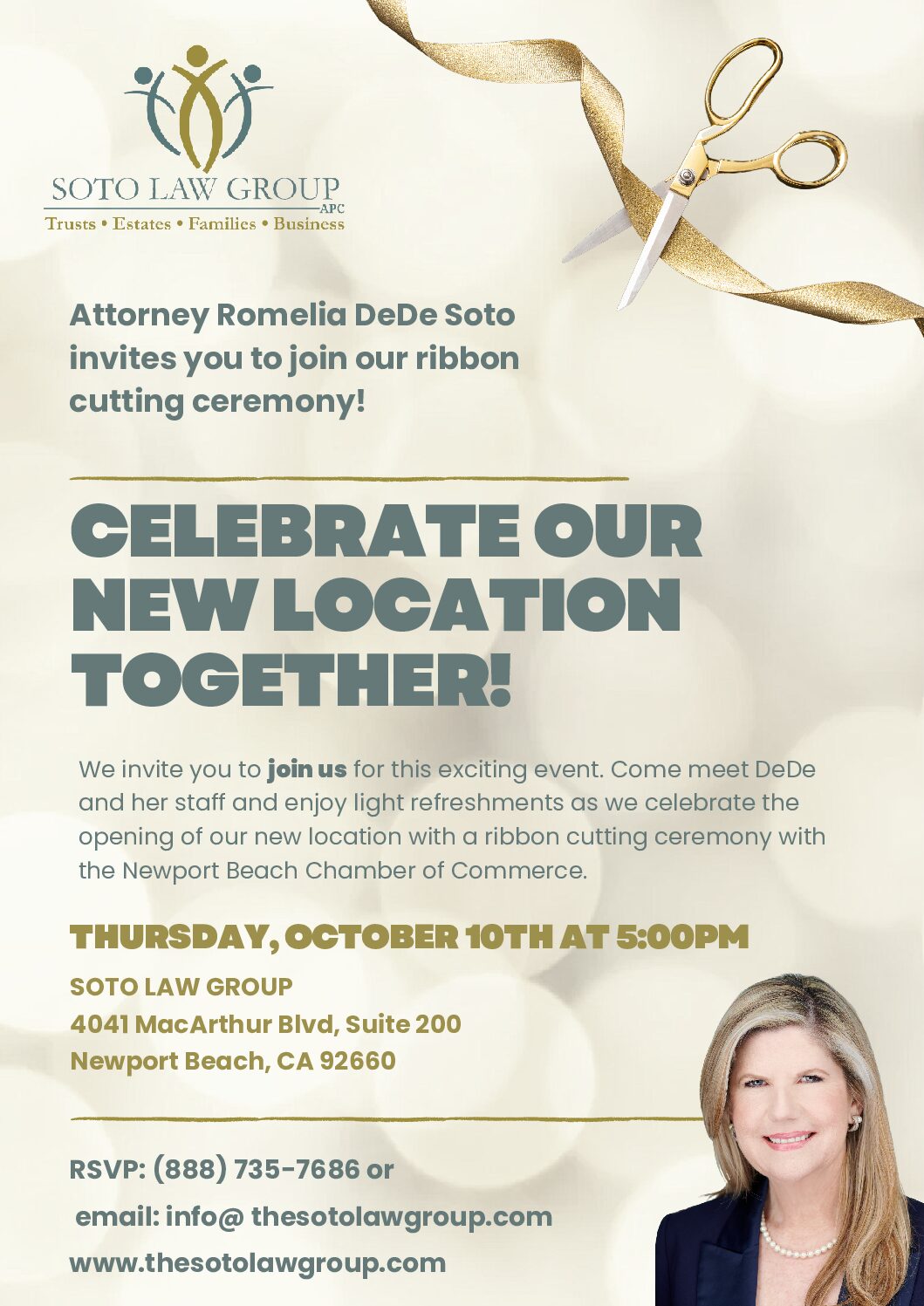 The Soto Law Group – Ribbon Cutting When 10/10/2024 5:00 pm - 6:30 pm Add To Calendar Download ICS Google Calendar iCalendar Office 365 Outlook Live Where The Soto Law Group 4041 MacArthur Blvd, Suite 200 , Newport Beach, CA, 92660 Event Type Ribbon Cuttings Please RSVP to (888) 735-7686 or email info@thesotolawgroup.com