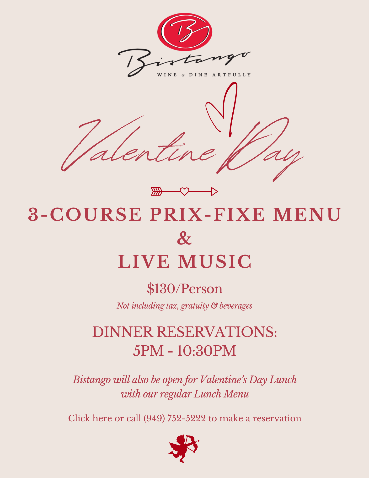 Don’t miss Valentine’s Day at one of Orange County’s most romantic restaurants – Bistango. Beyond the incredible atmosphere of the restaurant, with its art gallery walls and live music, the restaurant will have a chef-curated 3-course prix-fixe menu, featuring show-stopping items like Braised Short Rib Ravioli, Blue Lump Crab Cake, Seared Scallops, Surf and Turf, and ended perfectly with a Chocolate Mousse Dome. Pro tip: ask your server for a wine pairing for each course, or for a bottle for the table from the restaurant’s bast and incredibly impressive, award-winning wine list. Whether it’s under the palms on the open-air heated patio, tucked into a private booth in the dining room, or situated in the lounge for a front-row seat to the live music, Bistango is the perfect spot to celebrate the season of love. Live music plays 5 p.m. to 10 p.m. Reservations are highly recommended, so you don’t miss an opportunity to experience Bistango at its finest! For more information or to view the menu, visit www.Bistango.com.