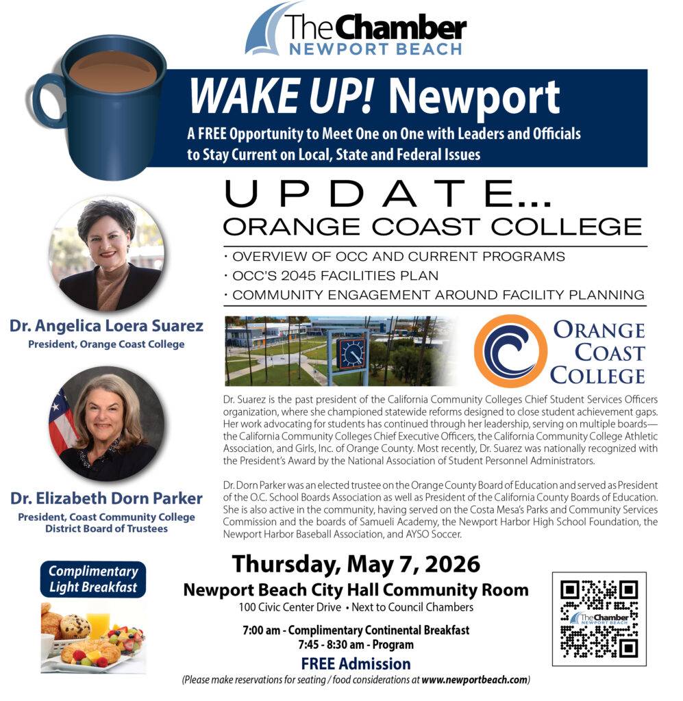 Wake Up! Newport – Update…Orange Coast College When 05/07/2026 7:00 am - 8:30 am Add To Calendar Download ICS Google Calendar iCalendar Office 365 Outlook Live Where Newport Beach Community Room 100 Civic Center Drive, Newport Beach, CA, 92660 Event Type Chamber Events Featured This event is free to the public, but please make reservations so we can plan for food and seating. RegistrationHow did you hear about this event?Please select...Received an eMailSaw on Social MediaReferred from a friendOtherName* First Last Company*Email* PhoneAre you a Chamber Member?* Yes No Breakfast Treats Provided