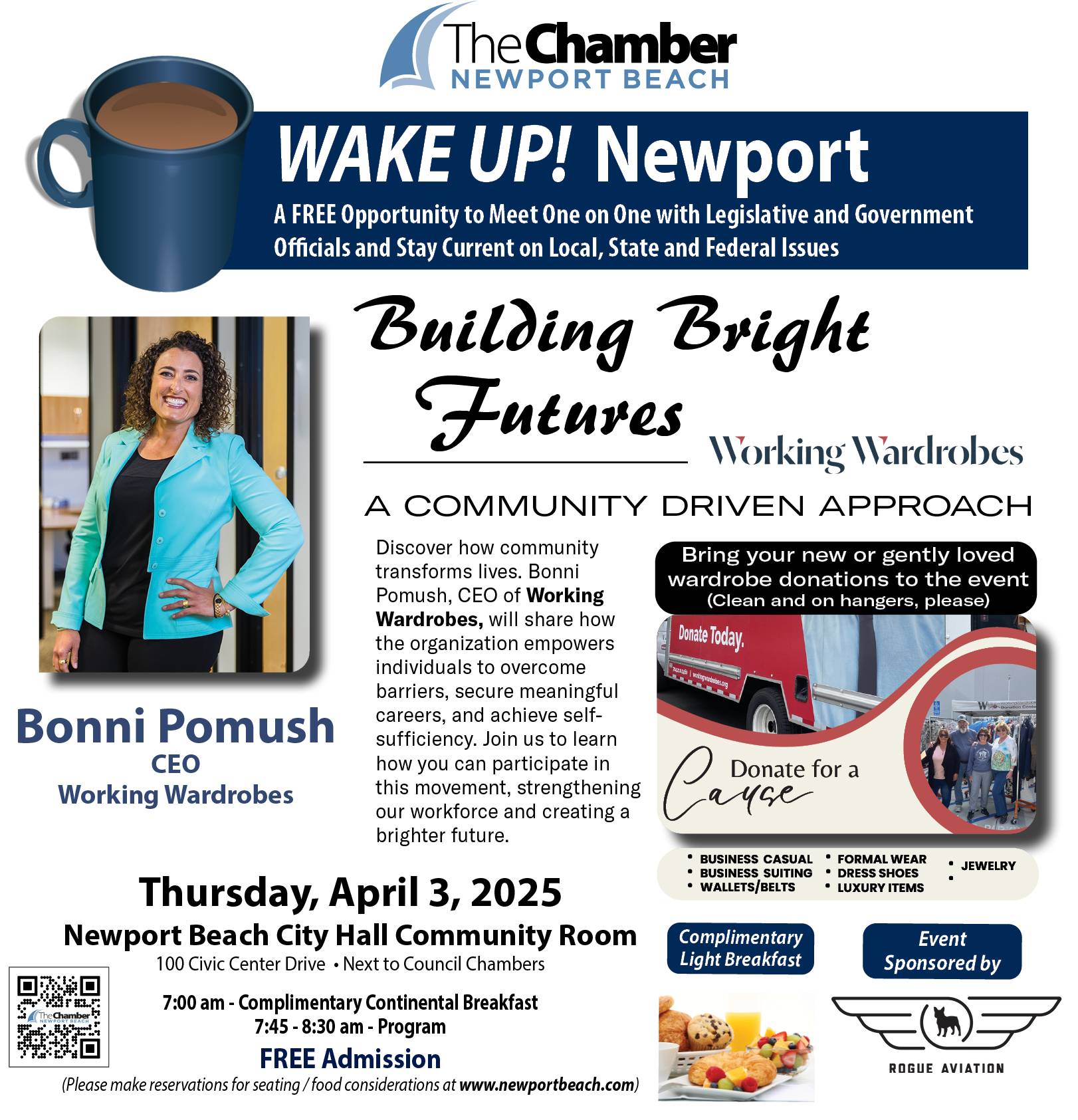 Wake Up! Newport – Working Wardrobes – Celebrating Newport – April 3 When 04/03/2025 7:00 am - 8:30 am Add To Calendar Download ICS Google Calendar iCalendar Office 365 Outlook Live Where Newport Beach Community Room 100 Civic Center Drive, Newport Beach, CA, 92660 Event Type Chamber Events Featured Please bring clothing donations to the meeting. This event is free to the public, but please make reservations so we can plan for food and seating. Breakfast Treats Provided Sponsored By
