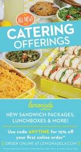 Use code ANYTIME for 15% off your first online catering order. Order online at catering.lemonadela.com.