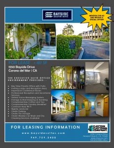 Find out what it’s like to love where you work! At Bayside Executive Suites, we offer a professional, executive suite environment coupled with gorgeous views of the Newport Bay. Our upstairs bay view suite is 187 sf with sliding glass door private access to a patio so you can capitalize on the surrounding beauty. Along with our friendly staff, we offer onsite reception services, parking & storage, along with daily & weekly building perks. Give us a call at 949.759.3400 to schedule a tour. ****MENTION THIS AD FOR A SPECIAL OFFER****
