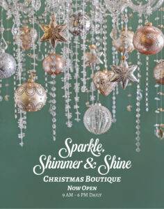 Explore our refined palette of apricot gold and pewter green decor, accented with twinkling lights and sparkling crystals. Cedar garlands, elegantly adorned with crystals, add a contemporary touch. Bring Christmas to life with our handpicked collection of ornaments, garlands, wreaths, and gifts. Let our beautiful displays inspire your holiday decorating and fill your home with timeless elegance. Join us for an unforgettable Christmas Boutique experience and let your holiday celebrations sparkle with warmth and joy!